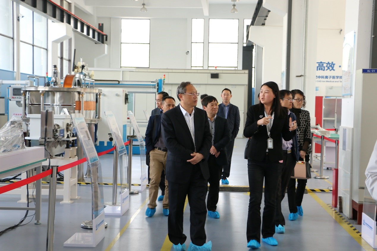 高懷荃一行首先參觀了公司超導質子治療系統裝配測試基地,相關負責人向調研組一行詳細介紹了質子治療技術原理、核心部件研制成果、產業化發展方向等情況。
